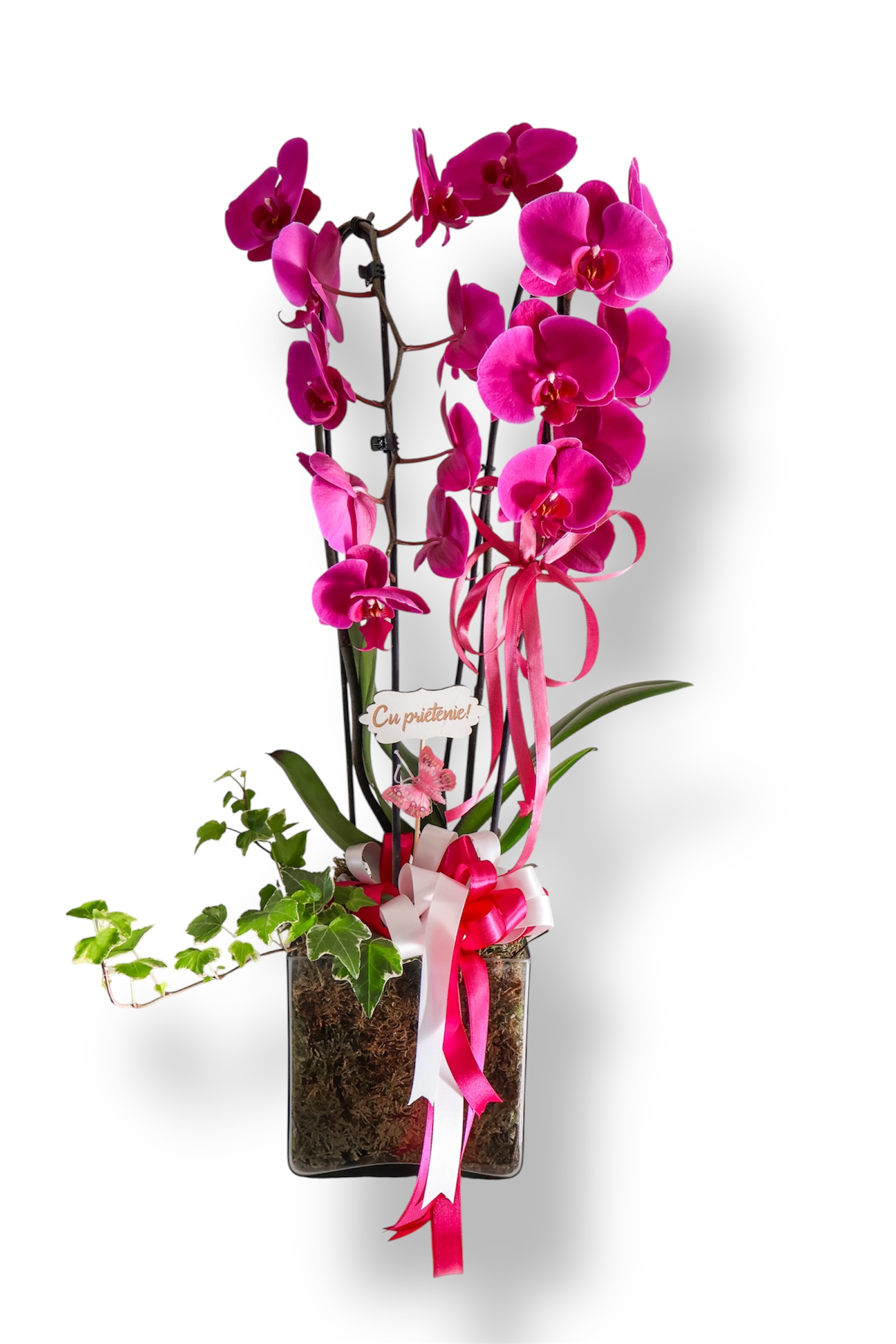 Aranjament în vas de sticlă cu orhidee fucsia