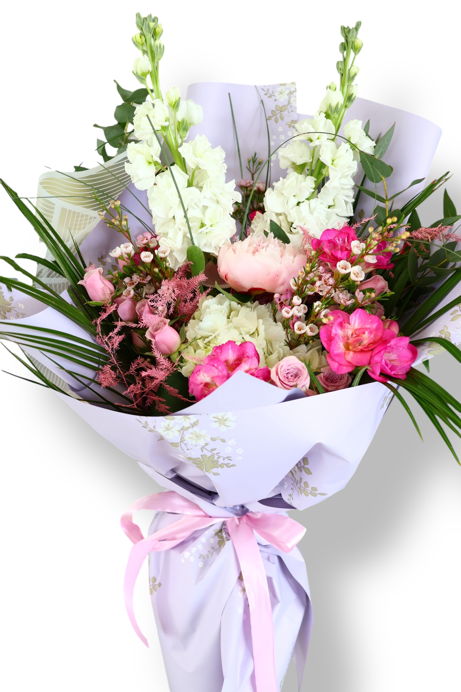 Buchet cu bujori, trandafiri, hortensie, frezii și verdeață