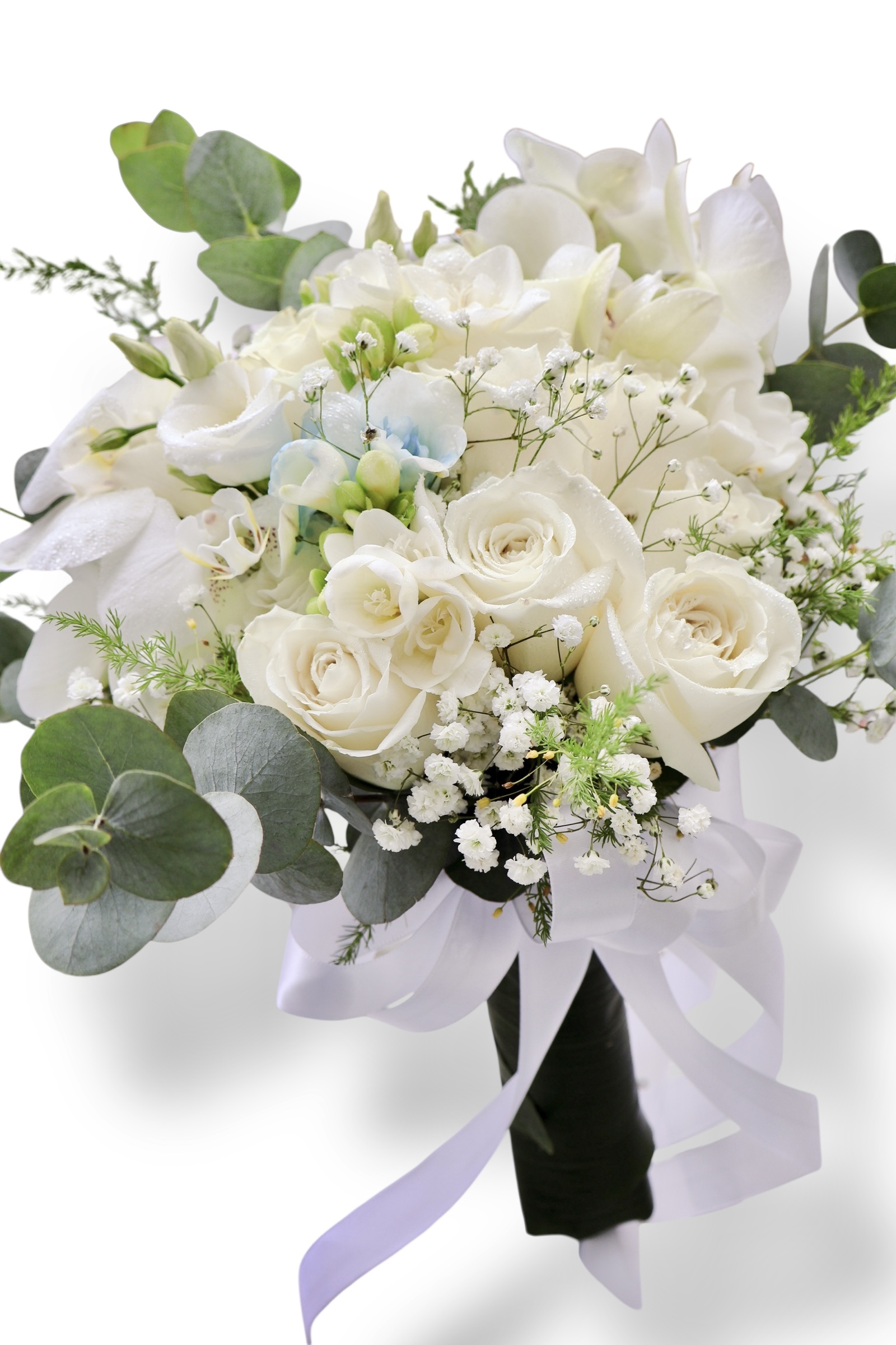 Buchetul este realizat manual din flori naturale în nuanțe de alb și verde, accentuate discret de o frezie bleu pastel. Texturile fine ale trandafirilor, gypsophilei se împletesc armonios cu frunzele de eucalipt, formând un aranjament clasic și proaspăt.