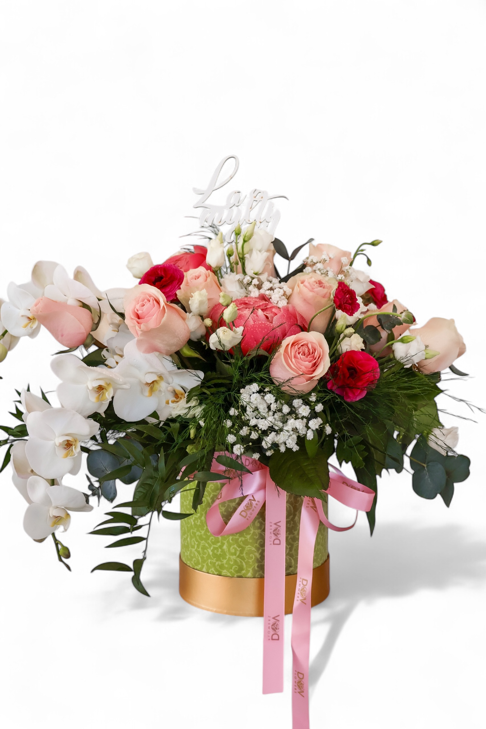 Surprinde cu un cadou floral de neuitat: o cutie decorativă verde cu detalii aurii, plină de trandafiri roz pastel, bujori parfumați, orhidee albe și flori delicate care transmit emoție, gingășie și eleganță.